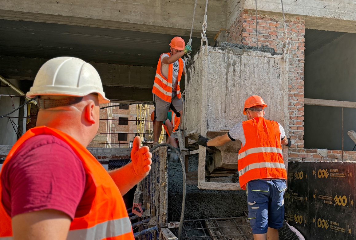 У 36 корпусі активно формується виносна комерційна частина. Зараз тут виконуються ключові етапи: виконується гідроізоляція, заливаються несучі колони, монтуються сходи та пандуси. Кожен із цих процесів є важливим кроком у створенні міцної та зручної основи для майбутніх закладів.