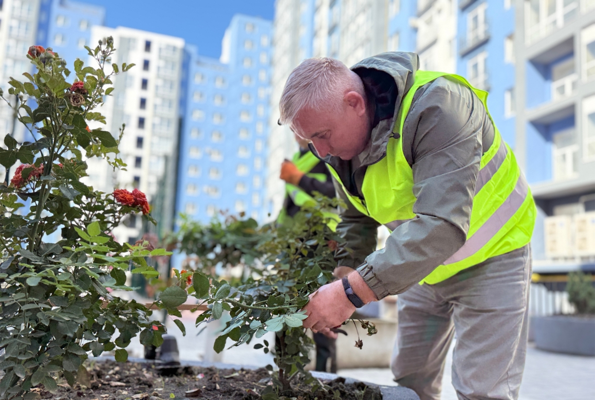 На території району проводяться сезонні роботи із зеленими насадженнями: обрізаються дерева, формується крона, а за потреби пересаджуються окремі рослини. Дбають і про квіти – обрізають троянди та інші багаторічні насадження, готуючи їх до зимівлі. Це не лише зберігає зелену зону, а й формує її привабливий вигляд у весняний період.